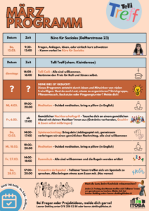 Der Telli Treff bietet jeden Monat ein abwechslungsreiches Programm für Jung und Alt, welches von ITOBA und einer Gruppe von Freiwilligen durchgeführt wird. Neue Ideen für Aktivitäten sind jederzeit willkommen.